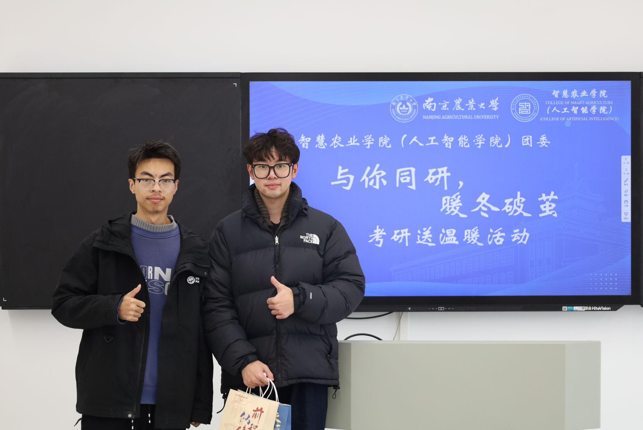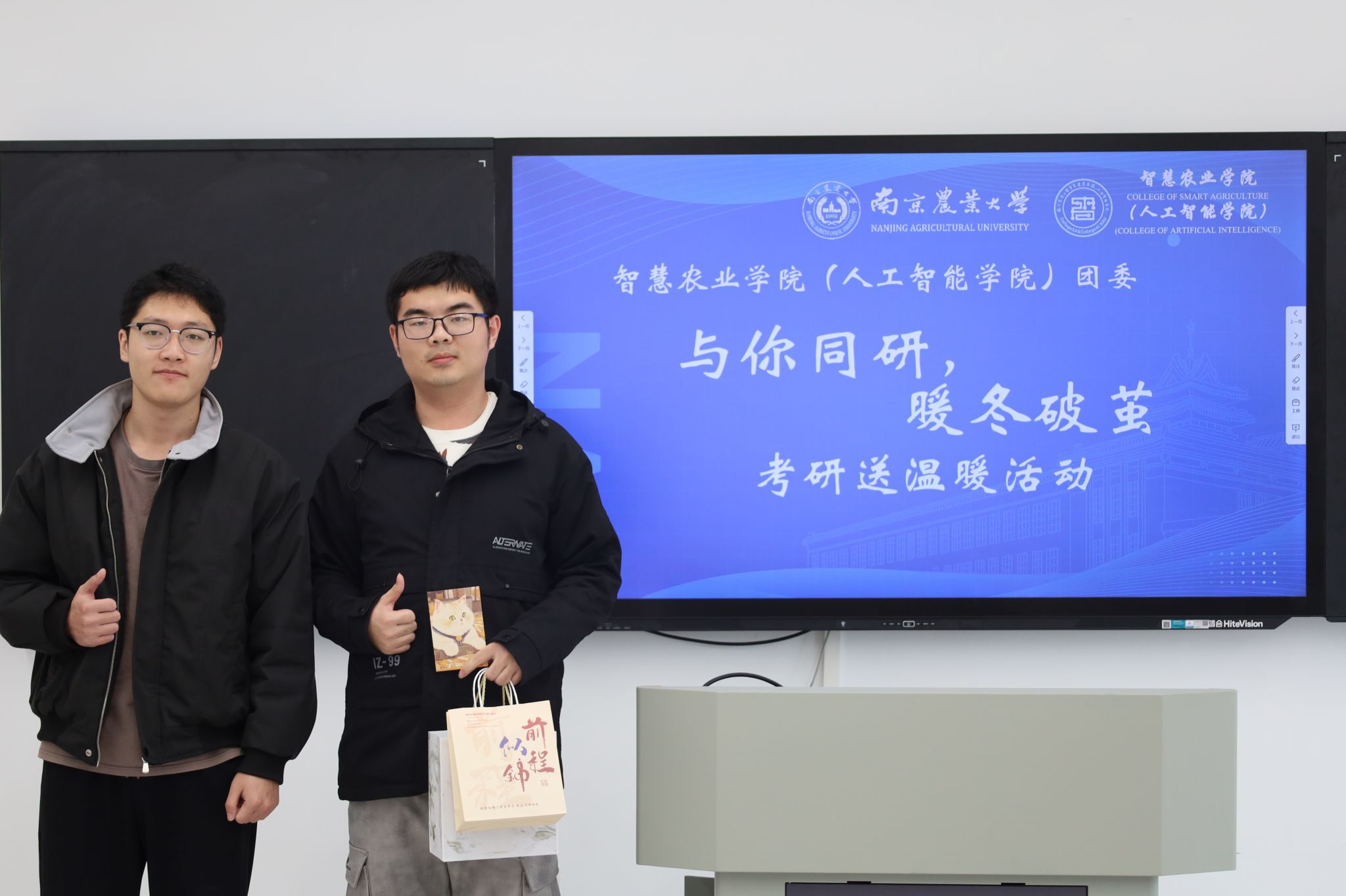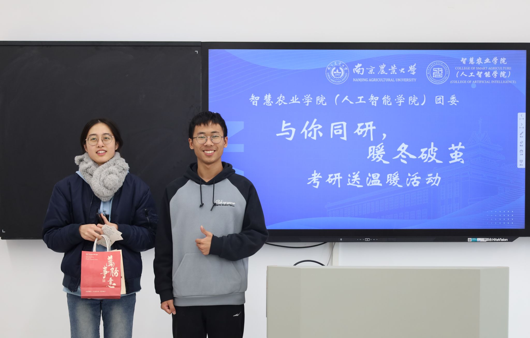 研途不孤,暖意同行。随着研究生入学考试的脚步日益临近,考研学子们正全力冲刺,为梦想奋力拼搏。为缓解他们的备考压力、坚定冲刺信心,12月5日至10日,南京农业大学智慧农业学院(人工智能学院)精心策划并举办了“与你同研,暖冬破茧”考研送温暖活动。本次活动由学院团委青协红会牵头组织,学院领导、师生及志愿者们共同参与,以丰富多元的形式为考研学子送去冬日的温暖与前行的力量,让凛冽的寒冬因这份关怀而暖意融融。