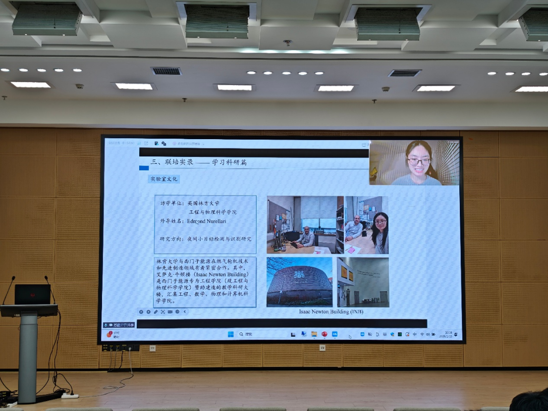 正在英国林肯大学开展CSC 联合培养的苏勤博士通过线上连线参与分享。她以自身申请经历为例,梳理了从提前联系国外导师、准备申报材料,到完成校内遴选与 CSC 网报的完整时间线。她还分享了初到林肯的鲜活见闻,如强调学术自主的实验室文化、简洁的午餐习惯以及夏季漫长的白昼,带来“正在进行时”的切身观察。