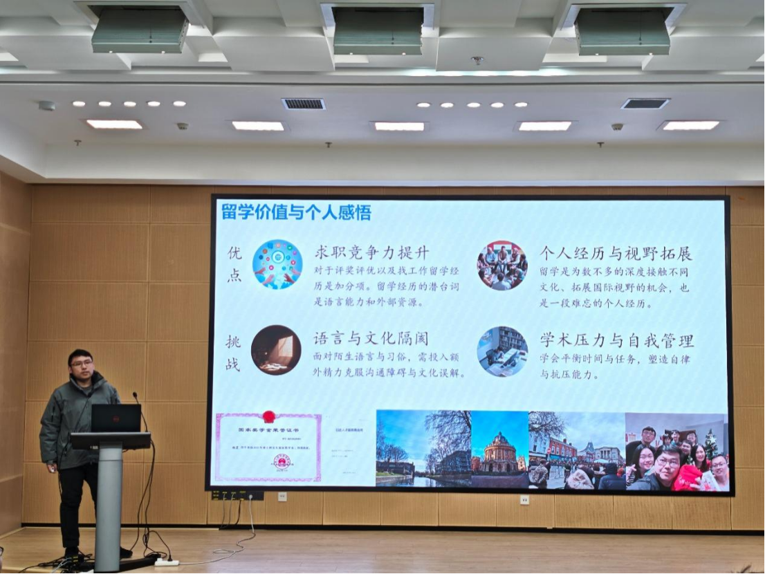 随后,工学院陈坤杰教授分享了他2023年9月在CSC资助下赴林肯大学进行了为期1个月的交流感受。他从更宏观的视角对比了中英高等教育体系,阐释了英国大学的悠久历史、紧凑学制及严谨的教授晋升路径。同时,他结合CSC评审经验,解读了评审标准,强调申请人国内在研项目相关性、研修计划可行性及国外合作平台水平是关键评价要素,为有意申报项目的师生提供了明确指导。
