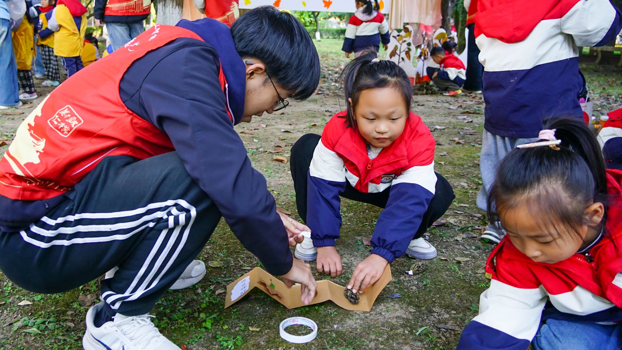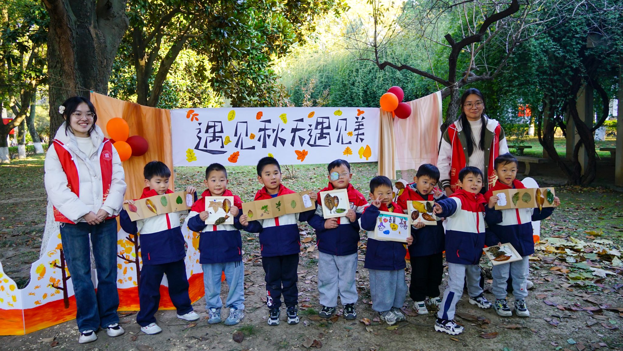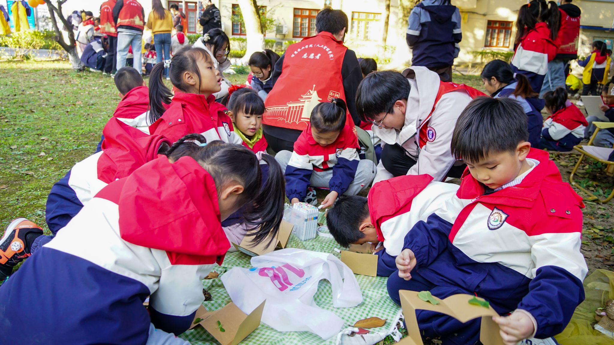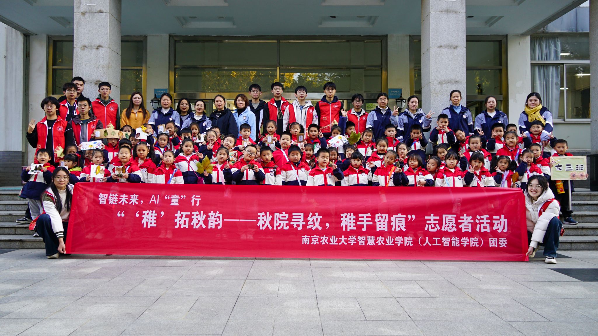 11月20日下午,浦口校区的林荫道上飘着金黄的梧桐叶,智慧农业学院(人工智能学院)“智链未来,AI‘童’行”志愿服务项目之“秋院寻纹,稚手留痕”活动在此温情启幕。本次活动由学院团委主办,邀请点将台幼儿园60名小朋友与40名大学生志愿者共同参与,在自然探索与手工创作中,把秋天的诗意与童趣定格在指尖。