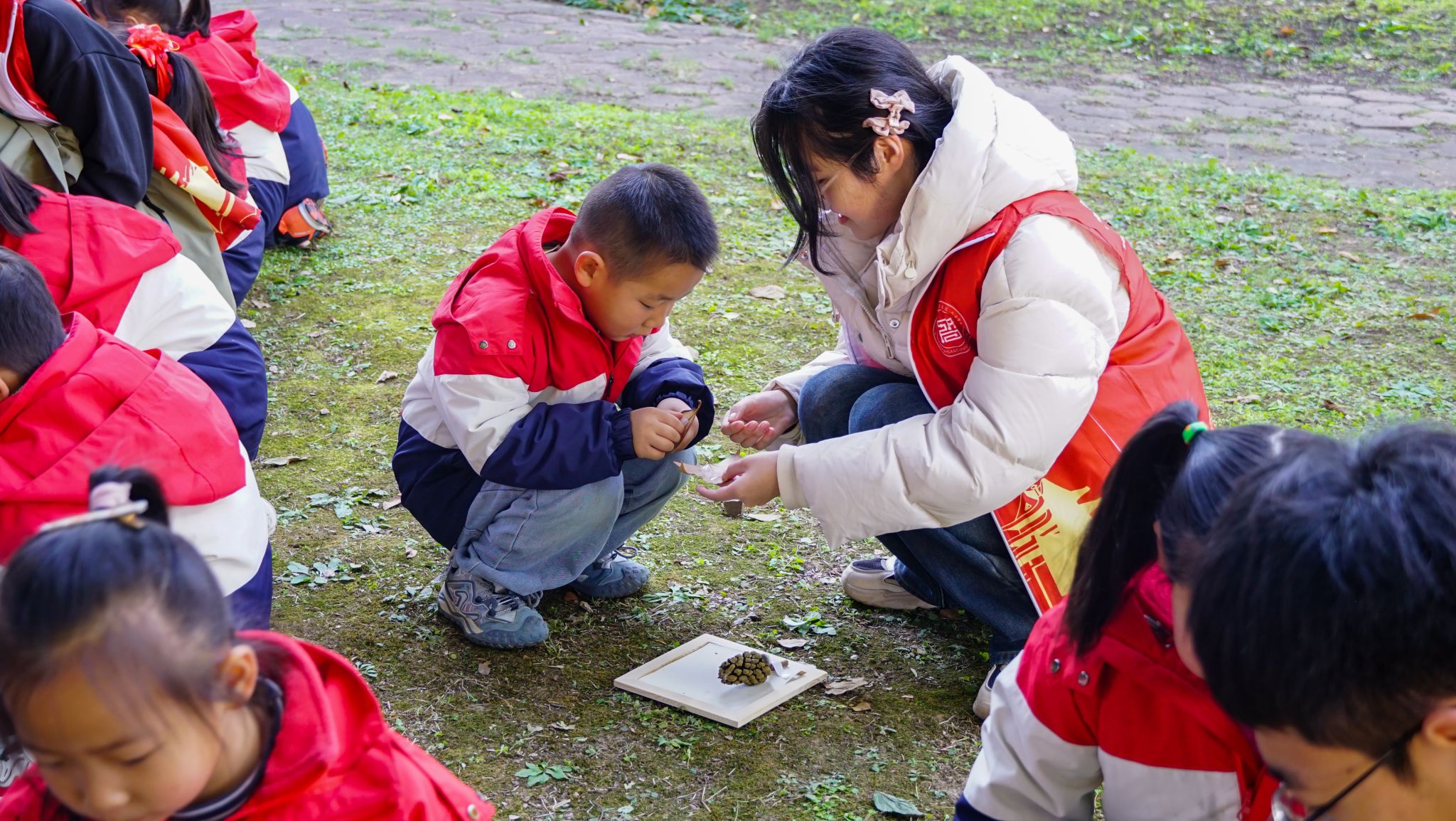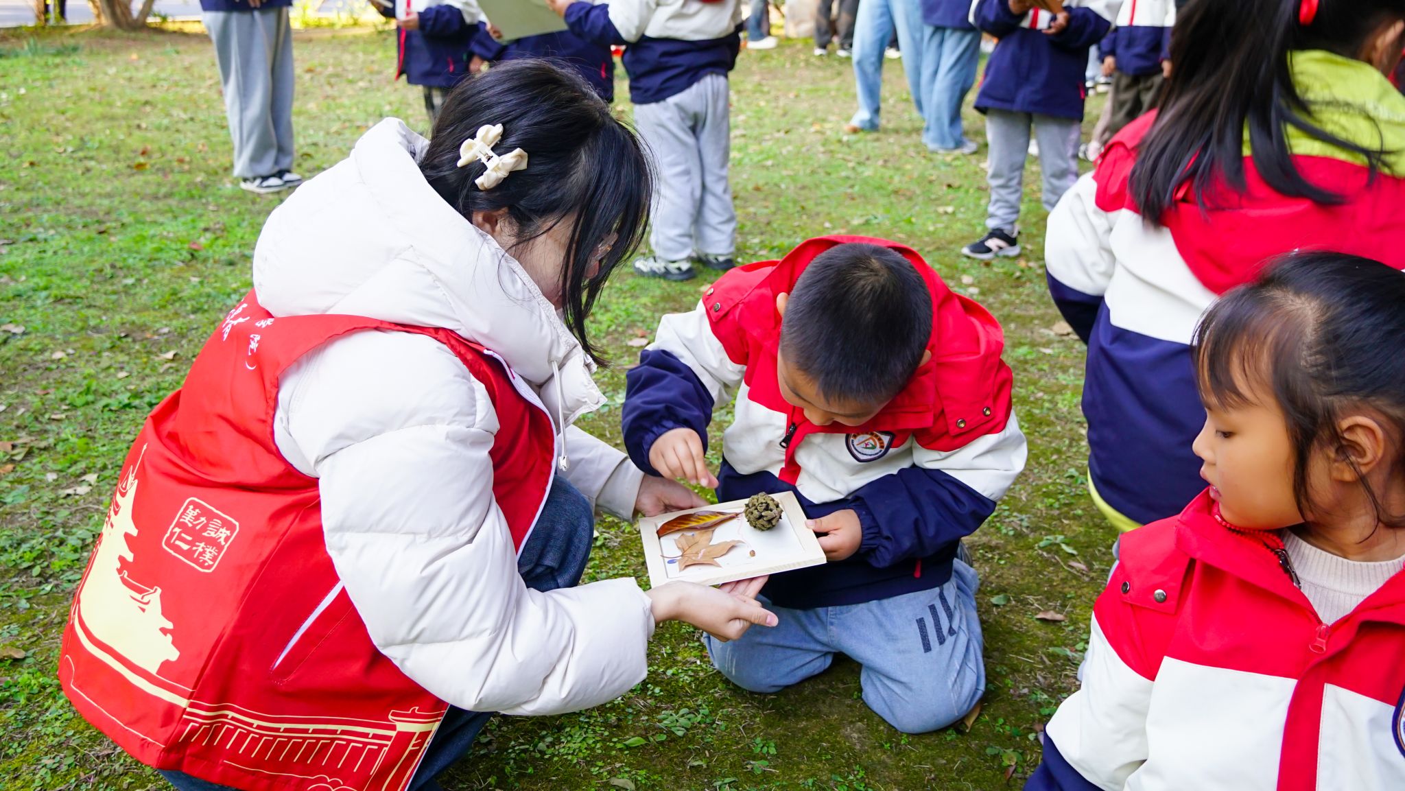 活动伊始,志愿者们化身“自然向导”,牵着小朋友的手漫步校园。金黄的梧桐叶在风中打着旋儿落下,火红的枫叶像小巴掌似的贴在地上——孩子们踮着脚尖追落叶,蹲在草丛里挑形状,小手里很快攥满了各式各样的“秋之信物”。“老师你看!这片叶子有五个角!”“这个纹路像小火车轨道!”稚嫩的惊叹声在林荫道间回荡,连阳光都似乎变得更温柔了。