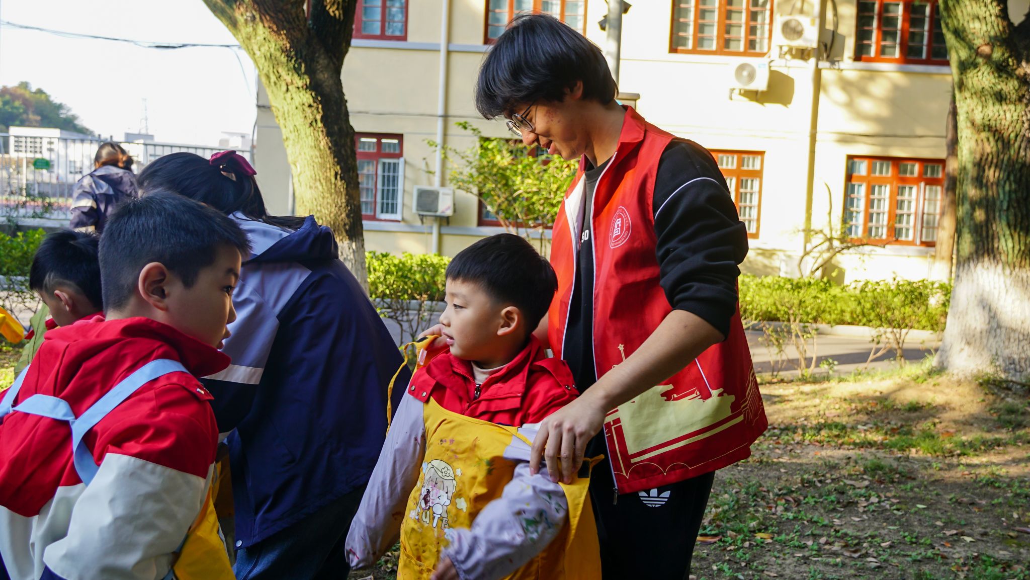 活动尾声,志愿者们牵着小朋友的手来到汇贤楼门口合影。阳光洒在孩子们仰起的笑脸上,也落在志愿者们温暖的眼眸里——镜头定格下这一幕童真与青春交织的瞬间,每一张照片都写满了“双向奔赴”的美好。