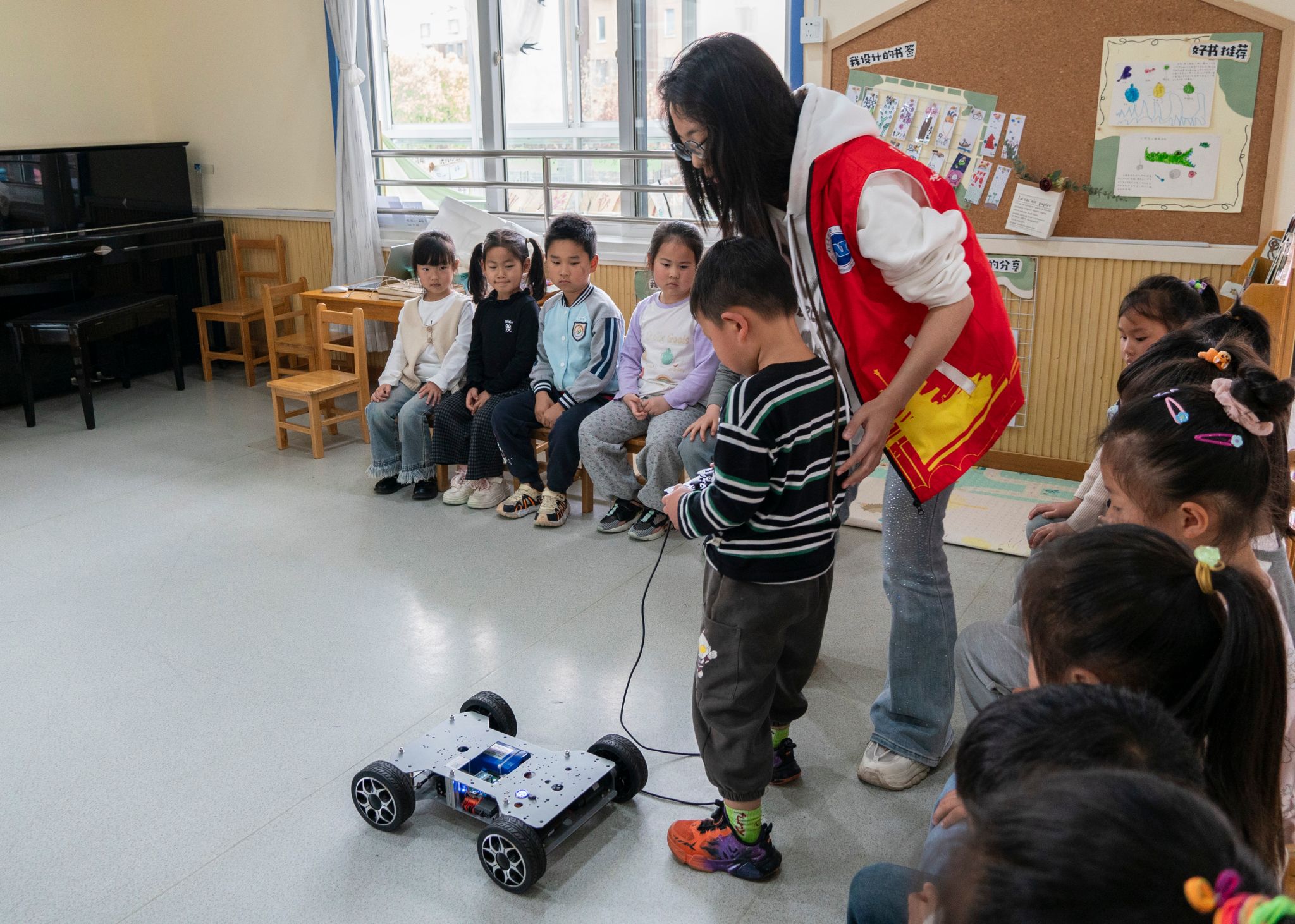 活动当日,志愿者团队提前1小时抵达活动现场,完成场地布置、设备调试等准备工作,以饱满的精神状态迎接孩子们的到来。活动开场的AI主题猜谜游戏迅速点燃全场氛围,孩子们纷纷举手抢答,现场气氛热烈;科普小课堂环节,志愿者们以动画短片、日常AI产品举例等形式,用童趣化的语言讲解人工智能的基础概念,高频互动引导孩子们主动思考;核心实操环节中,志愿者们带来学院学生自主研发的机器人小车教具,手把手引导小朋友们操作小车完成前进、转向等动作,耐心讲解简单的设计原理,当看到亲手操控的小车灵活移动时,孩子们纷纷发出惊喜的欢呼,在沉浸式的实操体验中直观感受科技的乐趣。整场活动在轻松温馨的氛围中圆满结束,得到了园方老师的一致好评。