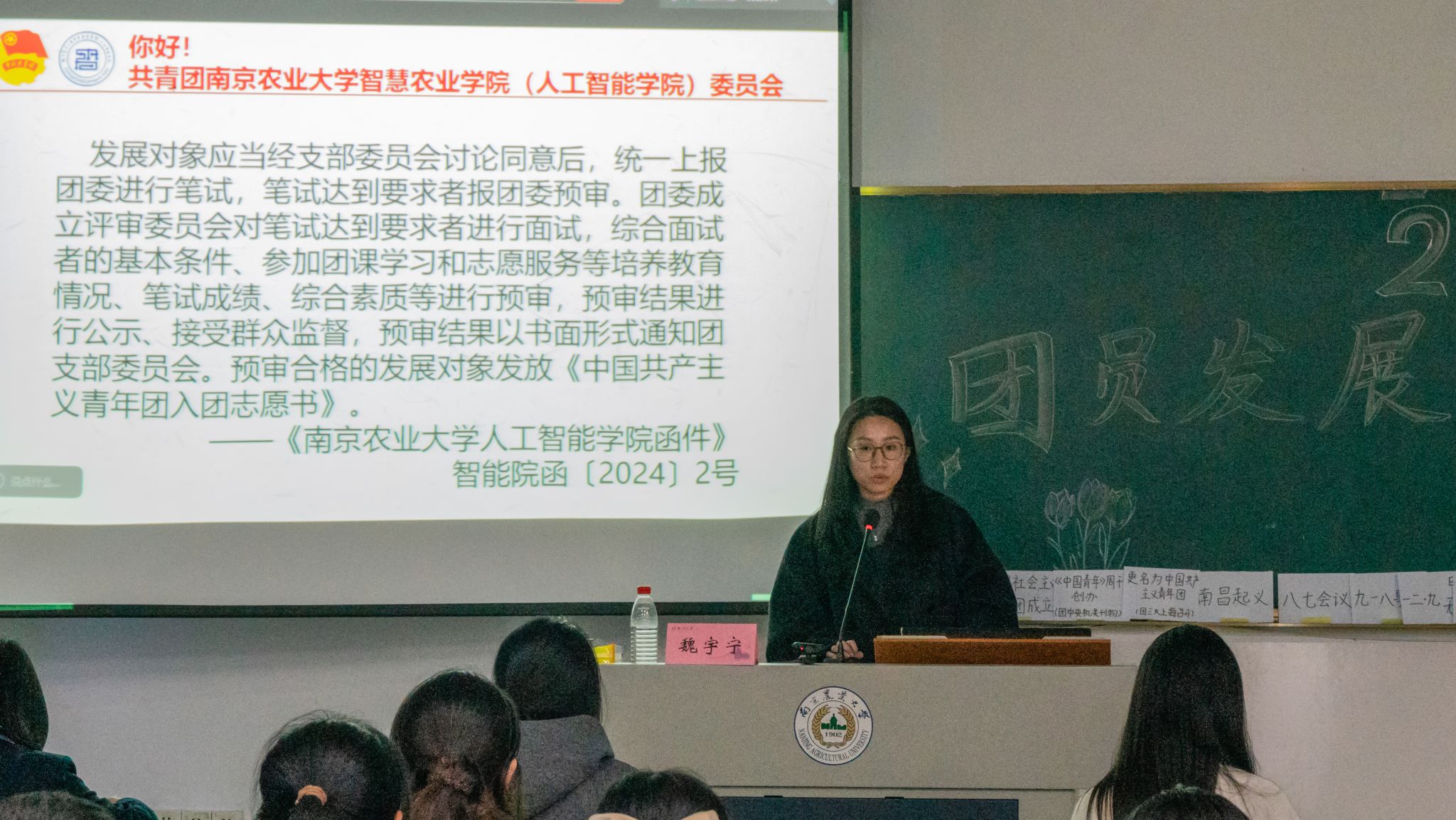 为深化青年思想引领、规范团员发展流程、严把团员入口关,智慧农业学院(人工智能学院)团委于3月25日顺利举办2026年上半年团员发展教育培训会。24、25级全体团支书及本年度上半年入团积极分子参会,院团委副书记魏宇宁、院学生团委副书记王子墨出席指导,培训采用线上线下同步形式开展。