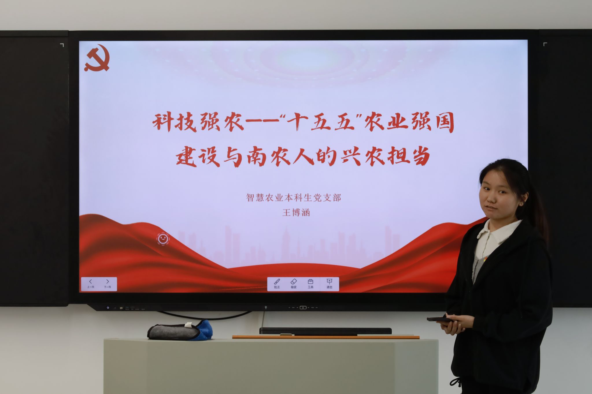 来自不同党支部的五位新发展党员代表结合自身思考,依次上台从历史方位、服务意识、底线思维、行动路径、兴农担当等不同维度分享了学习感悟。包北阳同志分享了自身对读懂新蓝图的历史方位与战略跨越的理解,指出了“十四五”到“十五五”的历史方位变化与战略跨越;夏禾羽阐述了对“十五五”新部署与党员服务意识的看法,号召党员同志们要树立好服务意识,从思想上、方法上、行动上努力提升服务实效;梁晋缘同志分享了应对复杂变局的底线思维与青年担当,阐述了变局下的底线思维与青年担当路径;李想同志则从预备党员如何将“十五五”规划落实到行动中进行说明,向大家交流了未来一段时间如何将自身融入“十五五”时期的发展中;王博涵同志以“十五五”农业强国建设与南农人的兴农担当作为主题进行了分享,讲述了农业强国的建设目标,号召大家作为南农人科技兴农的责任担当。会后,新发展党员们纷纷交流学习感悟。