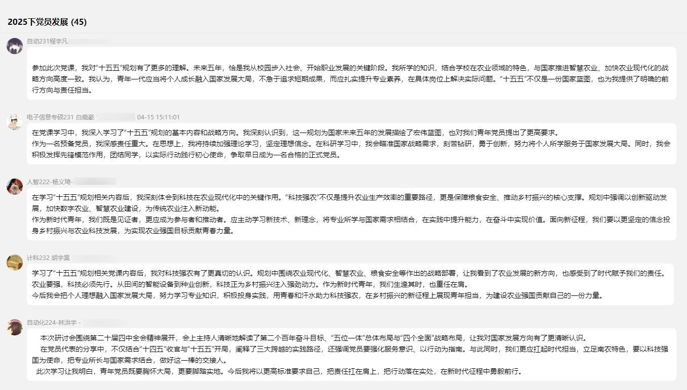 本次专题研讨会既是对“十五五”规划的系统学习,也是对新发展党员的思想动员。与会党员一致表态,将怀揣初心使命、以饱满热情与务实担当投身强国建设,用青春实干践行“强农有我、科技报国”的庄严承诺。全体新发展党员当以此次学习为契机,持续开展理论学习、锚定发展方向,在实干中淬炼党性,将个人成长融入国家发展蓝图,以奋斗之姿扛起青年责任,奔赴时代新征程!