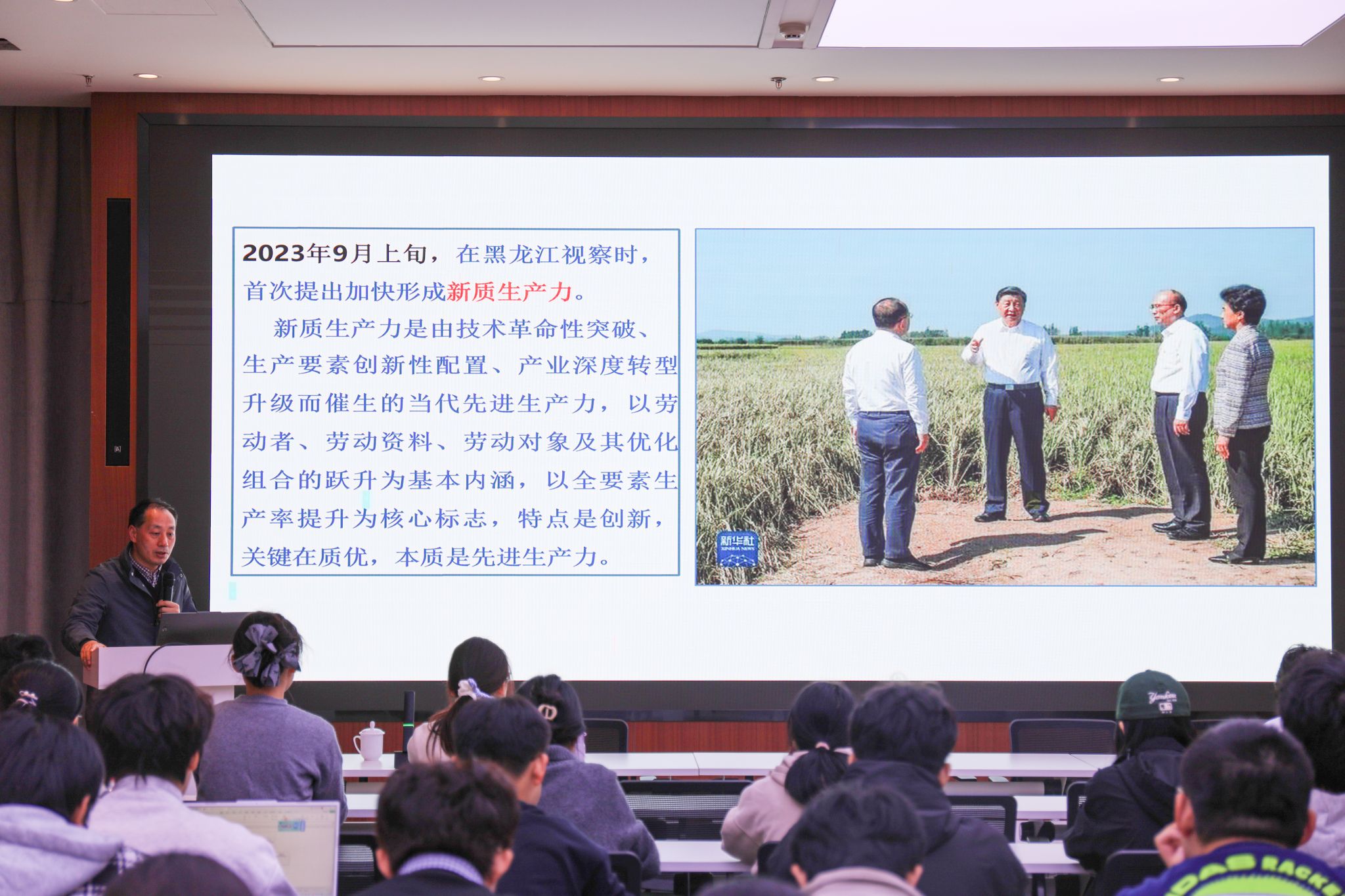 党课伊始,田永超教授系统梳理了习近平总书记关于农业农村信息化的系列重要论述,围绕“信息化为中华民族带来了千载难逢的机遇,没有信息化就没有现代化”“用物联网、大数据等现代信息技术发展智慧农业”等论断,结合2023年习近平总书记提出的“新质生产力”概念,深入阐释了智慧农业作为先进生产力的时代内涵。他指出,推进智慧农业建设是贯彻落实党中央决策部署的必然要求,更是建设农业强国的必由之路。他详细解读了农业强国应具备的“五强”特征——供给保障强、科技装备强、经营体系强、产业韧性强、竞争能力强,并强调智慧农业在实现这些目标中的关键支撑作用。面对我国农业发展中存在的耕地资源紧张、水资源利用效率不高、肥药施用效率偏低、农业劳动力老龄化等现实挑战,他指出,智慧农业是提升农业综合生产能力、提高全要素生产率的重要路径。