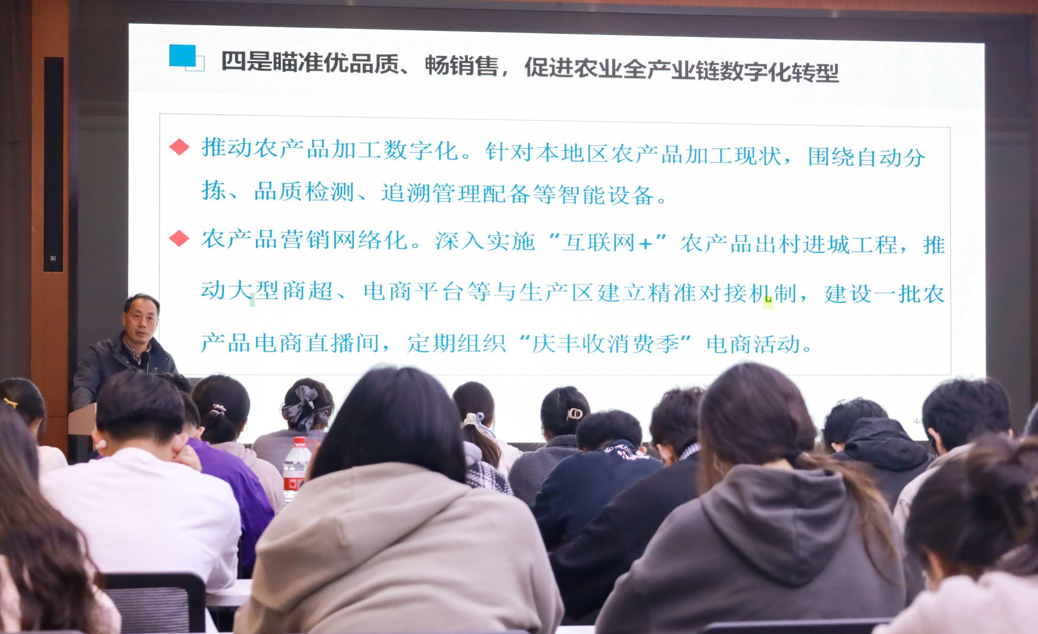 为深入贯彻落实党中央关于农业农村信息化与智慧农业发展的战略部署,进一步增强师生对智慧农业战略意义与发展路径的系统认知,10月27日晚,智慧农业学院(人工智能学院)常务副院长田永超教授以“智慧农业创新驱动农业强国建设”为题,在白马基地为师生讲授了一堂内容丰富、思想深刻的专题党课。党课由学院党委副书记吕一雷主持,组织员张鸣、实训中心章世秀、本科生辅导员封筱以及2023级学生代表共同参加。